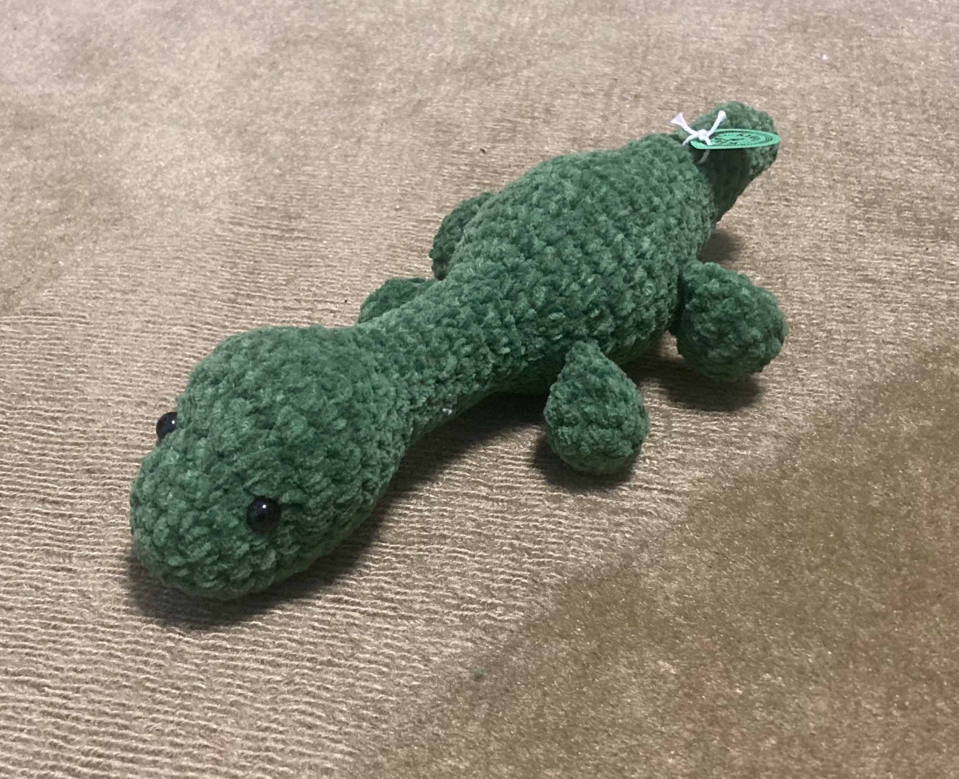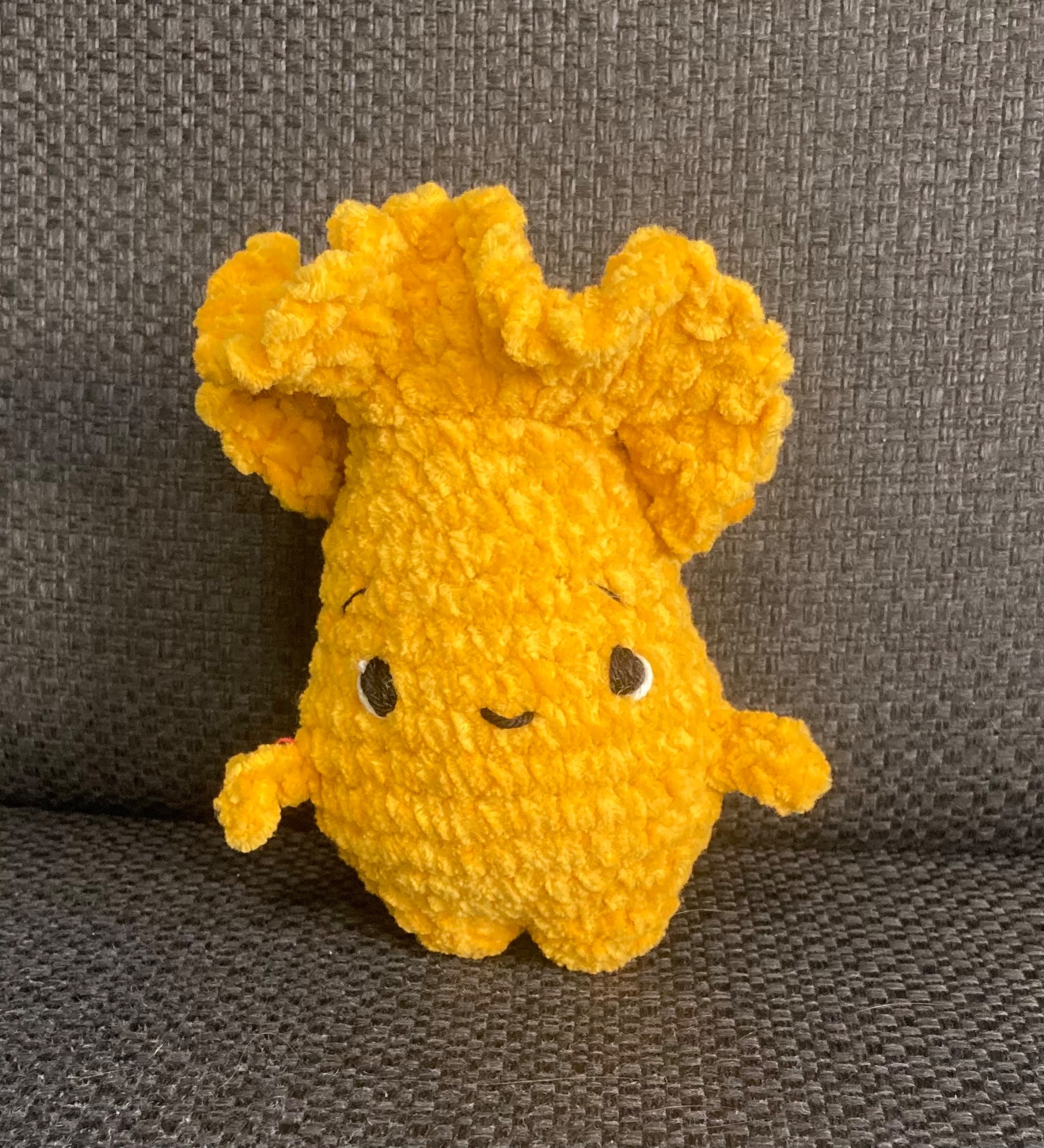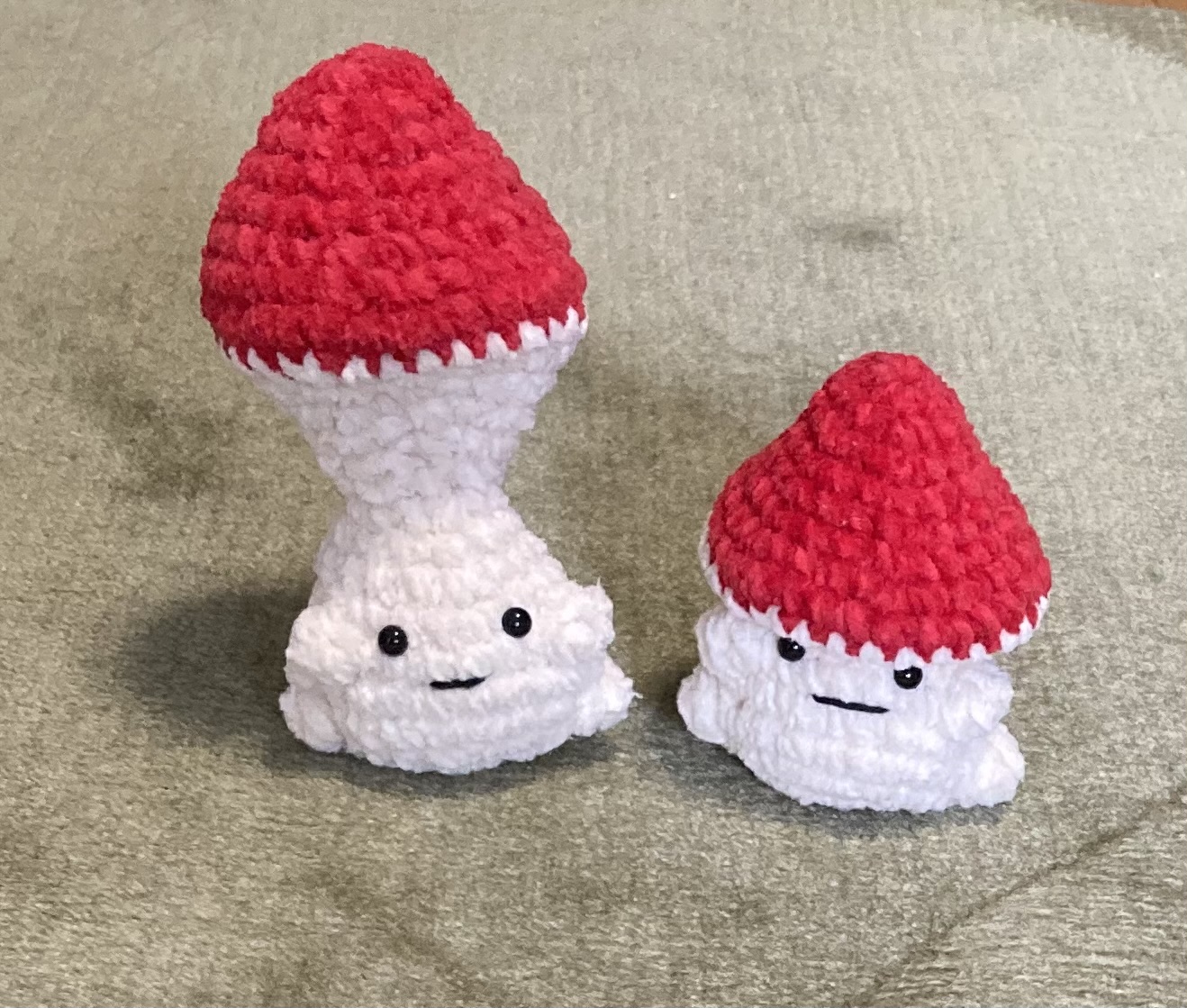 Nyt on aivan erityisen suloisia sienityyppejä! Tämä kantarellikaveri kirjotuilla lankasilmillä on vielä uutta kotia etsimässä.
