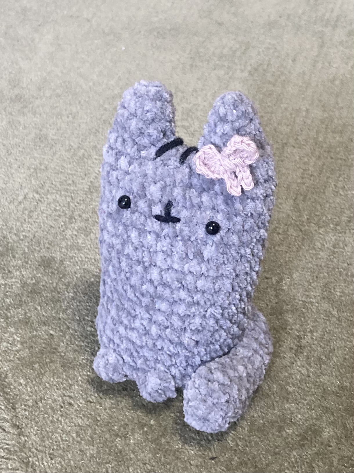 Kissan korkeus maasta korvan kärkeen on noin 13 cm. Rusetti on poistettavissa, jos se ei olisi mieleinen.