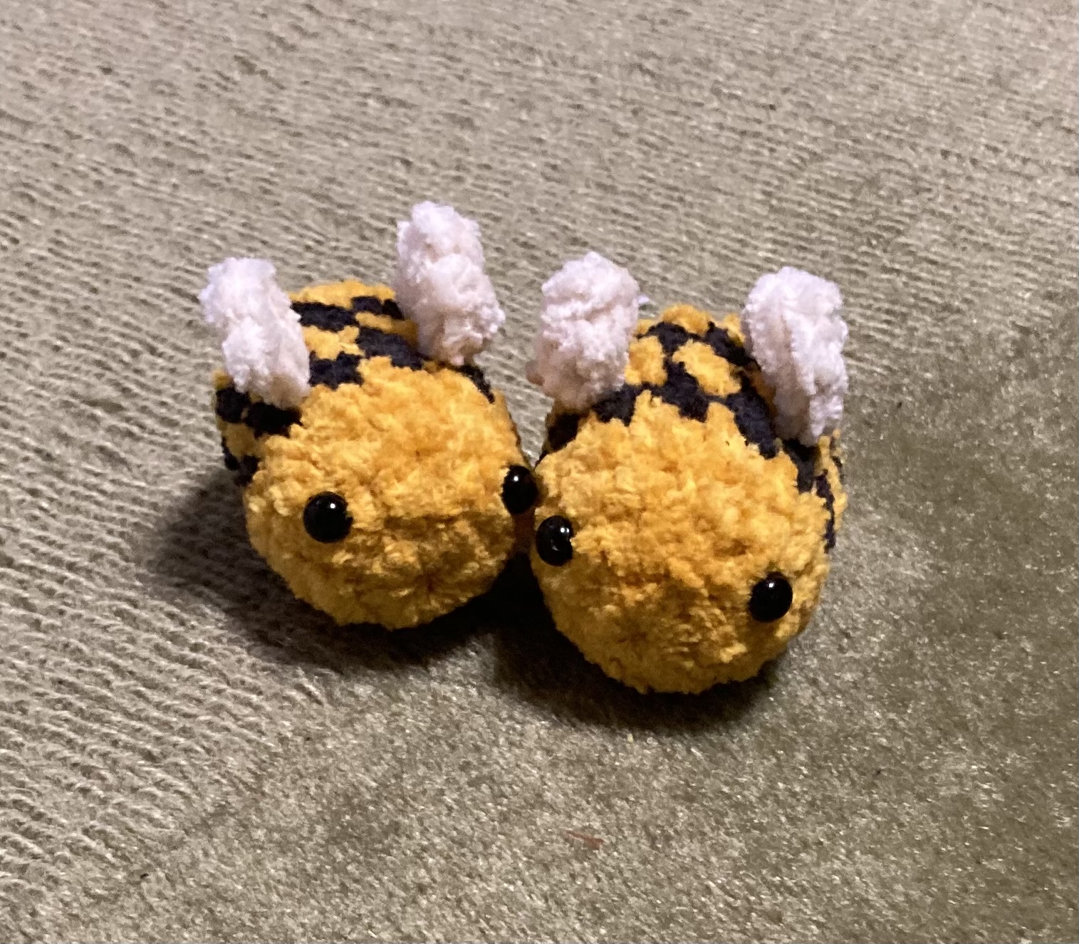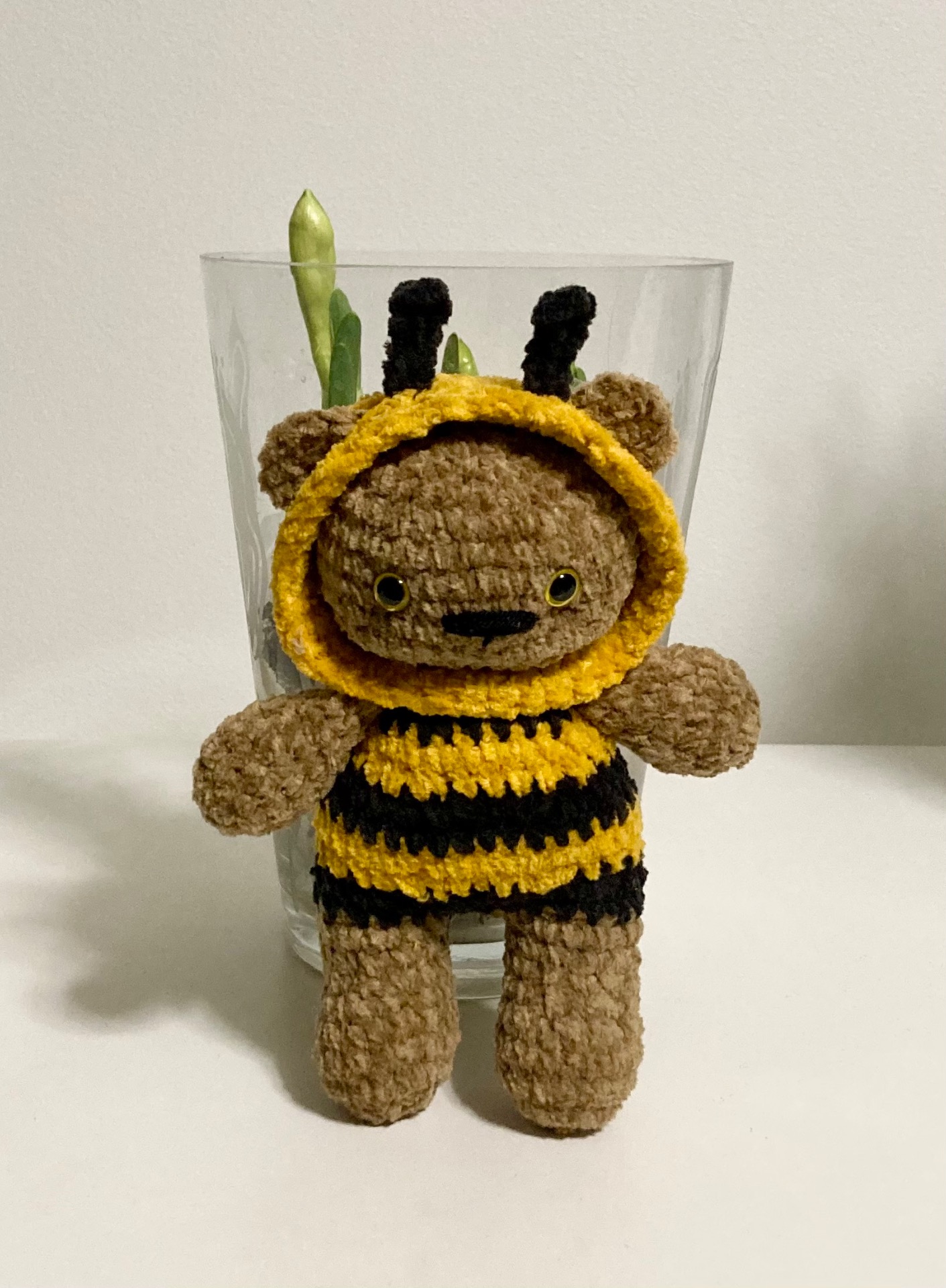 18.3. Törmasin töiden jälkeen mehiläisasuiseen nalleen. Oli alettava virkata enkä voinut lopettaa kesken vaan virkkasin kunnes tuli valmista. Suloinen!