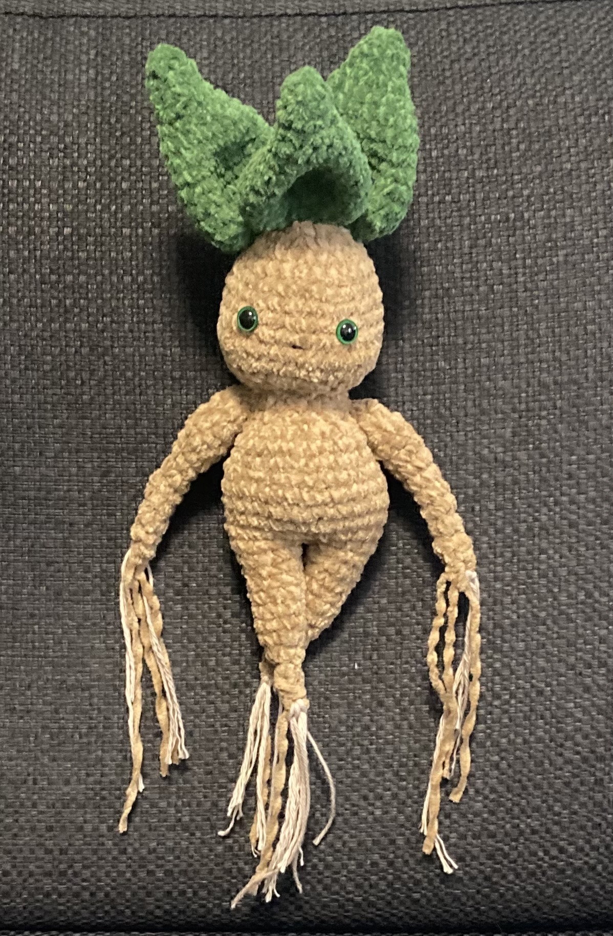 27.2. Eilen aloitin alruunan virkkaamista ja tänään sain valmiiksi. Maalasin sille sopivan vihreät silmätkin. Pidän paljon tästä tyypistä!