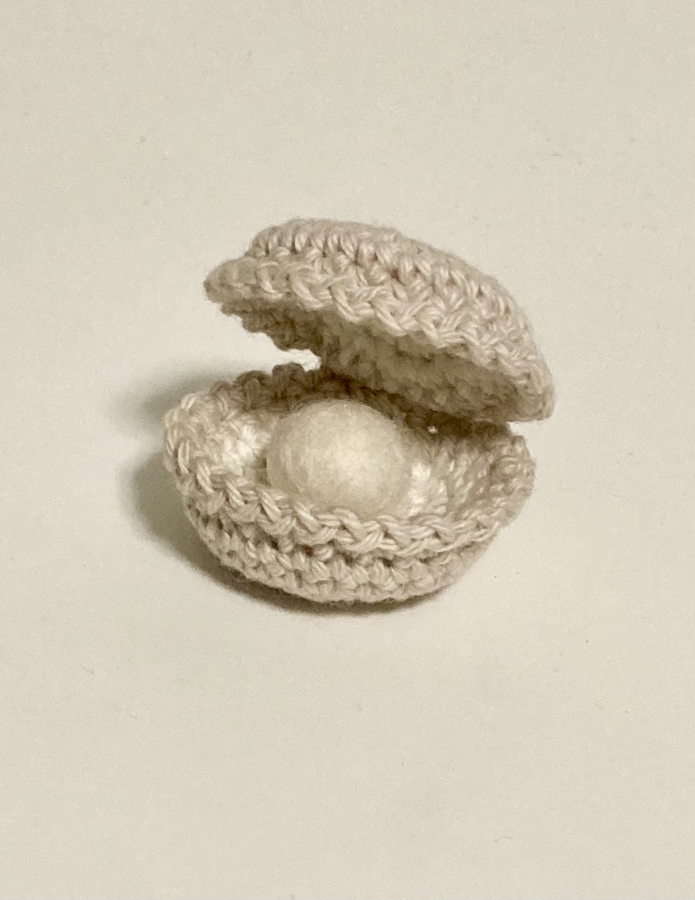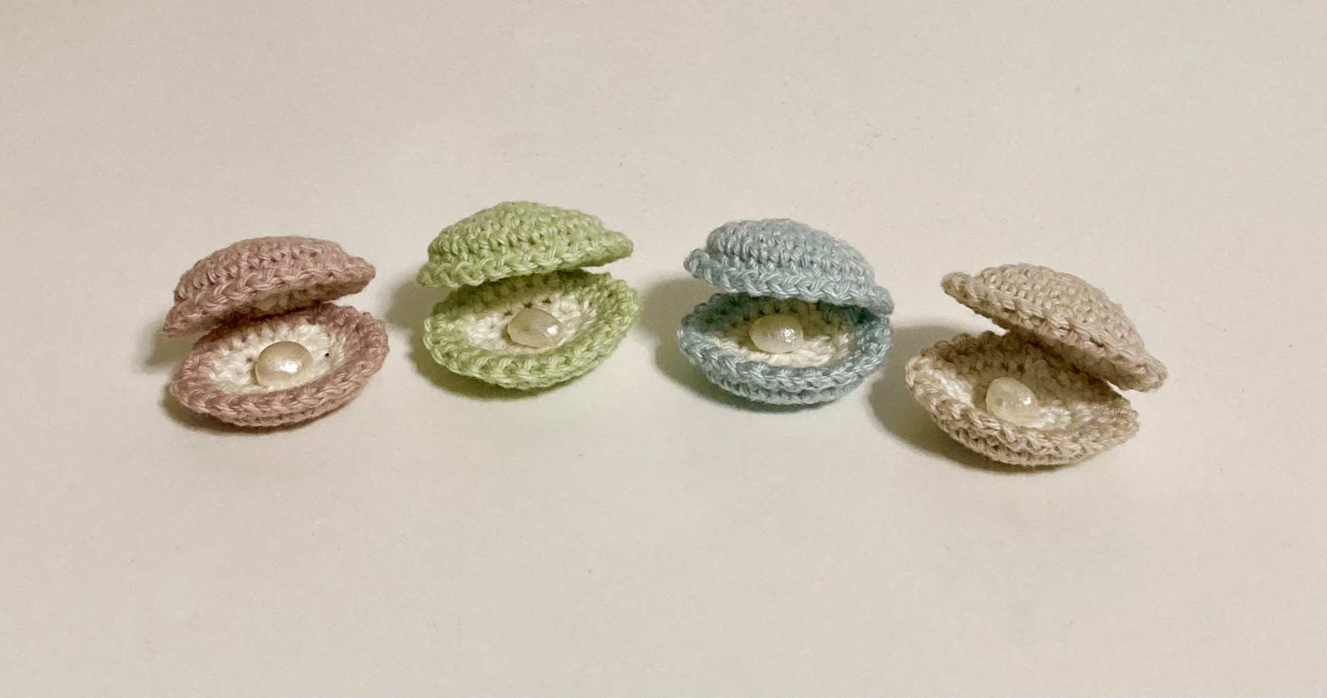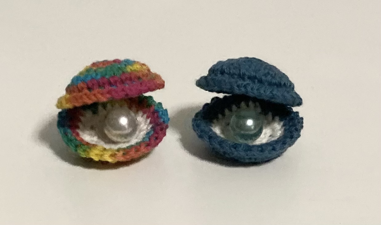 Tänään virkkasin helmisimpukoita. Omassani on helmenä huovutettu pallo. Muissa on nyt oikeat helmet, mutta kaipaisiko suurempia helmiä… Helmivarastoistani löytyi vain kolme isompaa helmiäispintaista helmeä, mutta voisikohan olla muunkinlainen. Hmmm.