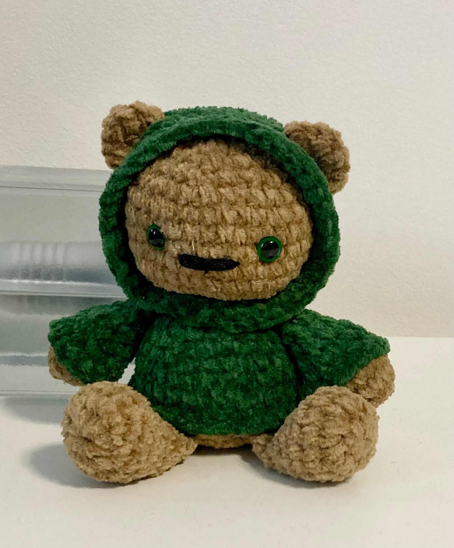 Olen ihastellut viime aikoina NooksHooksin hupparinalleja. Löysin myös suloisen hupparipupun, jota harkitsin, mutta ajatus nallesta vei kuitenkin voiton. Ensin meinasin muokata pupun ohjetta nalleksi. Sitten ajattelin, että voisin osata tehdä hupparin ja hupun emytoysin santa bear -nallelle. No, olisi ainakin kannattanut katsoa tarkemmin huppuhahmojen kuvia hupun kiinnityksen osalta. Jonkun verran säädin ja purin tehdessäni nallea enkä liittänyt huppua, kuten olisi kannattanut, mutta jos yritän toista, voisin onnistua paremmin. Nalle valmistui myöhään illalla ja vaikkei huppu täysin onnistunut, on nalle silti suloinen.